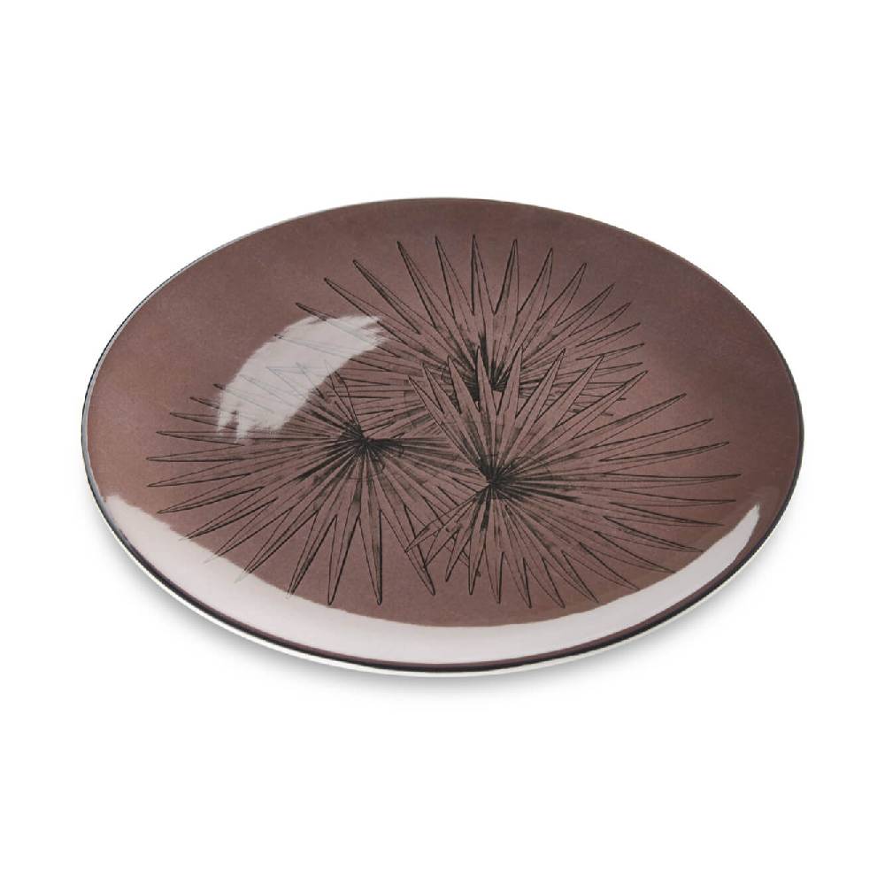 Birds of Paradise inspired the Paradise series. Six different Birds of Paradise with vibrant plumage perch on palm fronds. Each plate is in a different color and style.