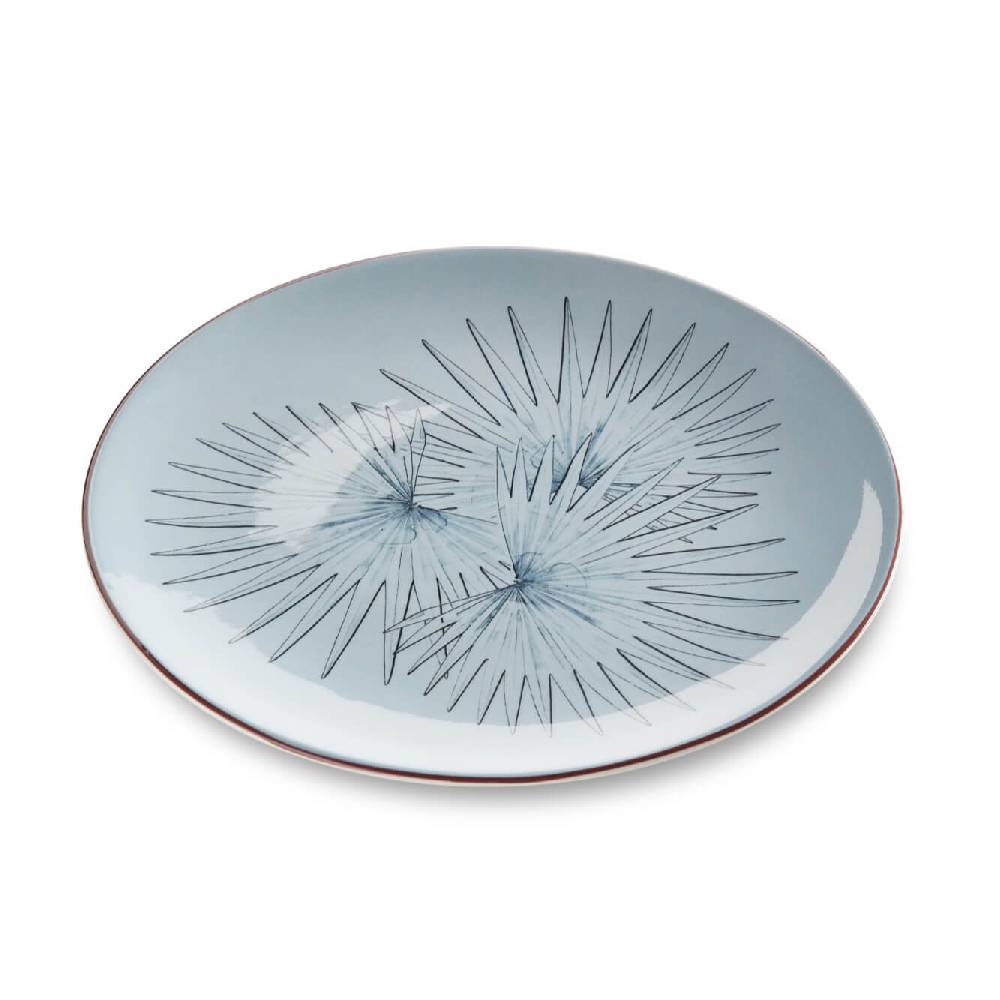 Birds of Paradise inspired the Paradise series. Six different Birds of Paradise with vibrant plumage perch on palm fronds. Each plate is in a different color and style.