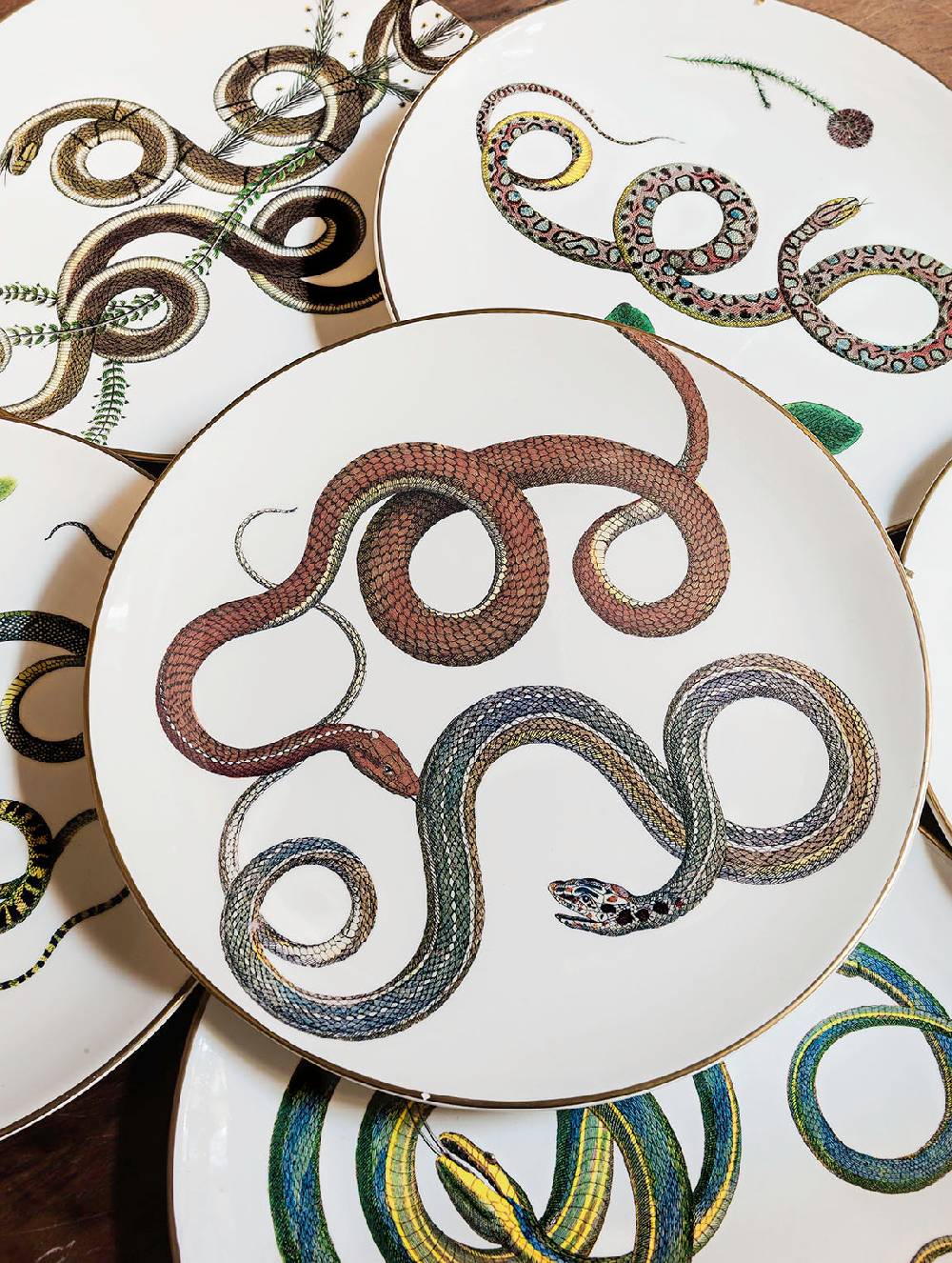 Six different types of intertwined snakes become elegant decorations in the SNAKES collection. They are available in white with a gold thread border and Pompeian red with a wide band of hand-painted gold leaf.